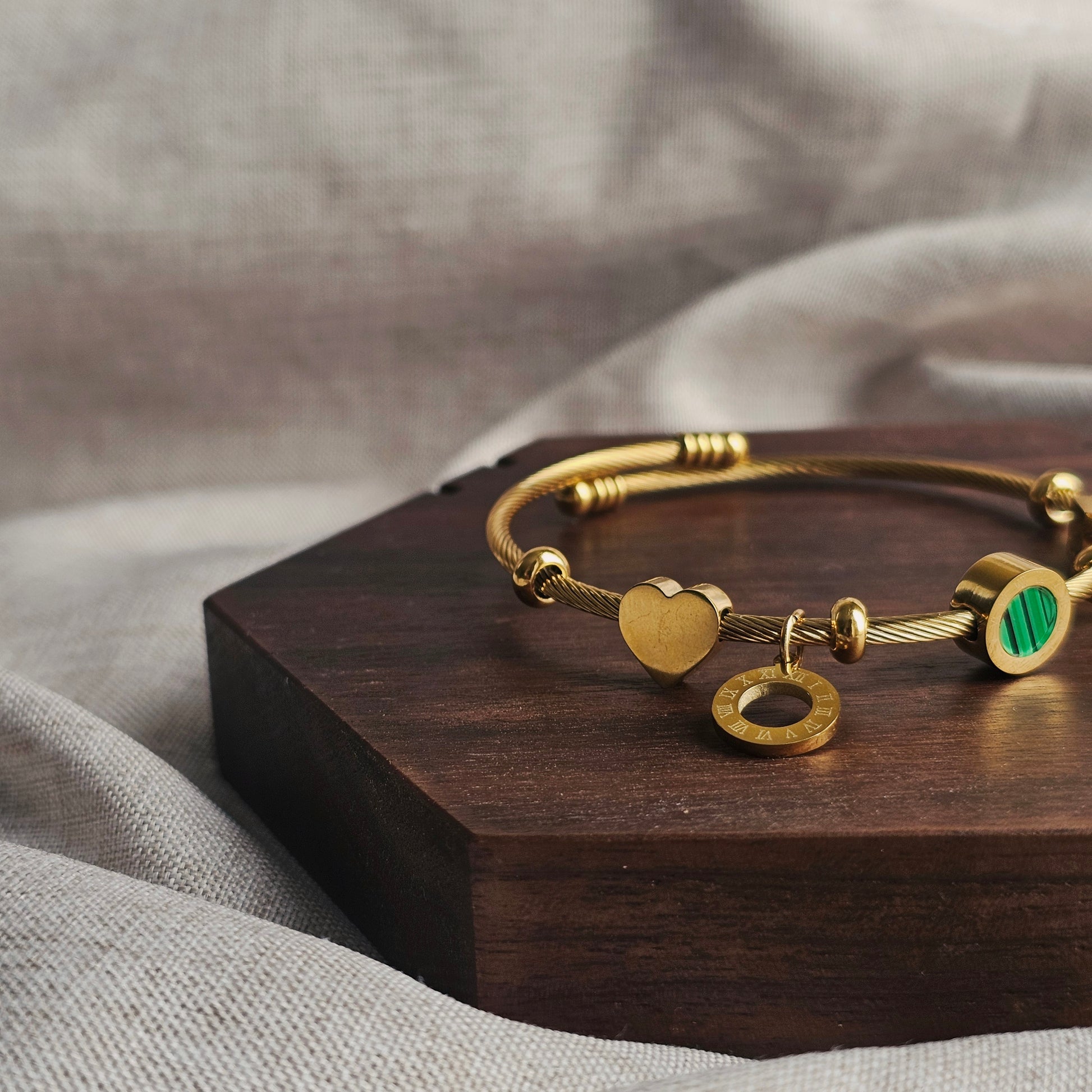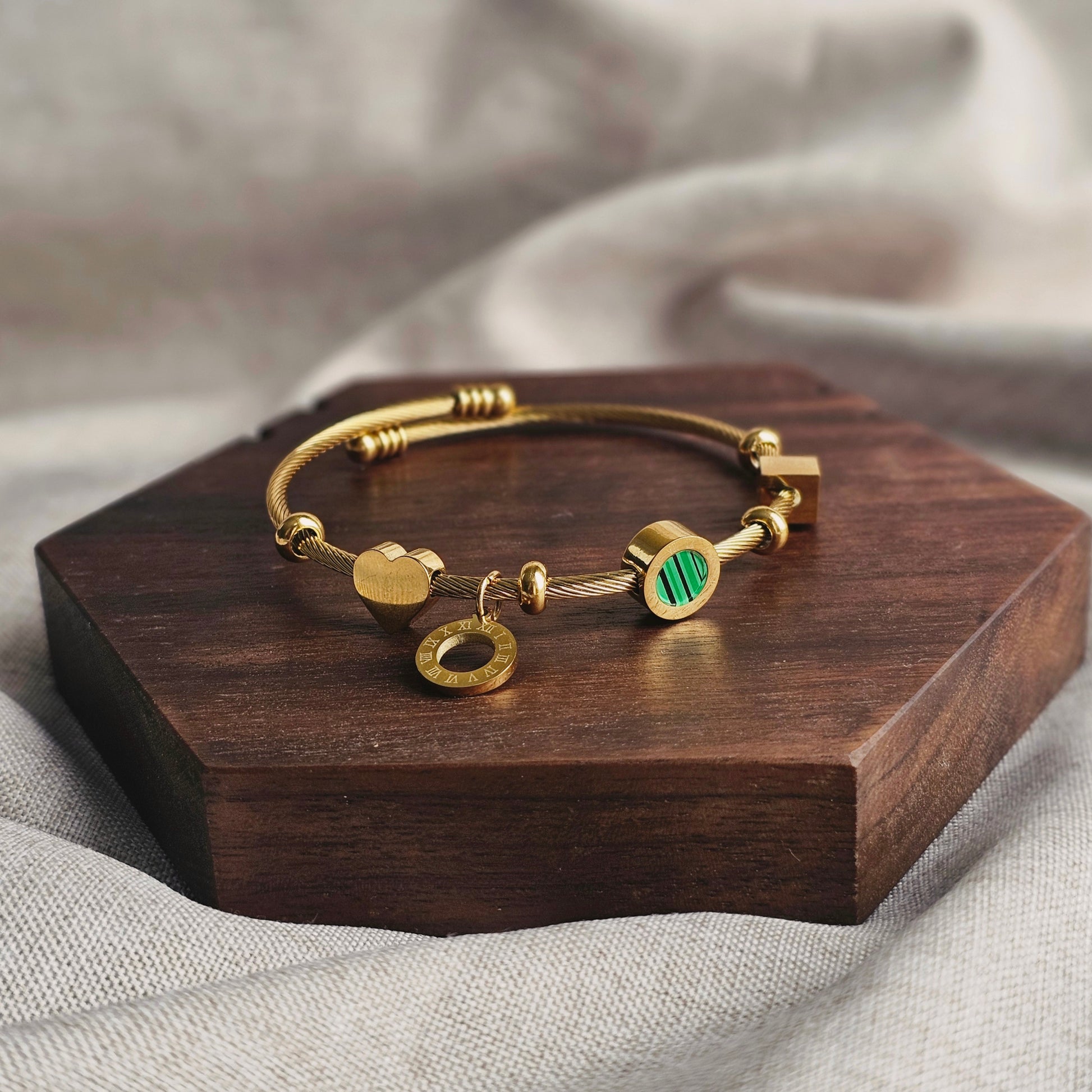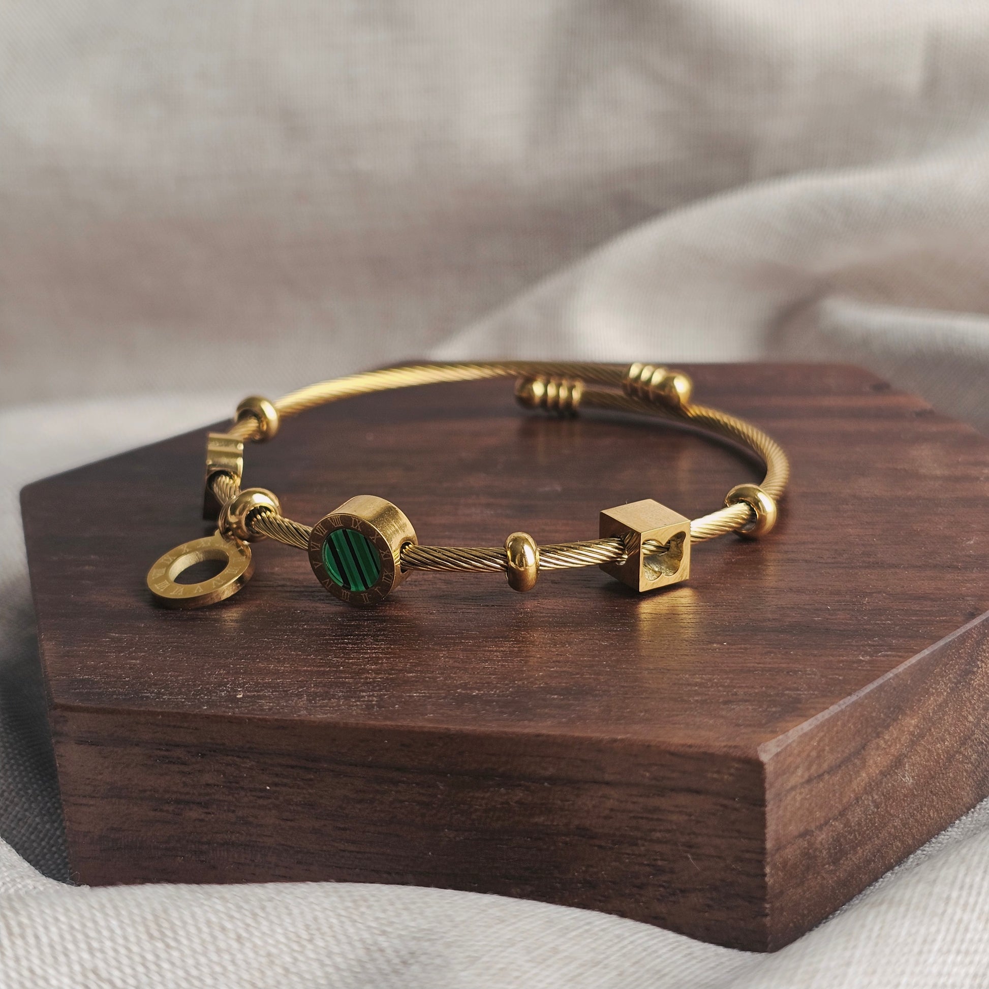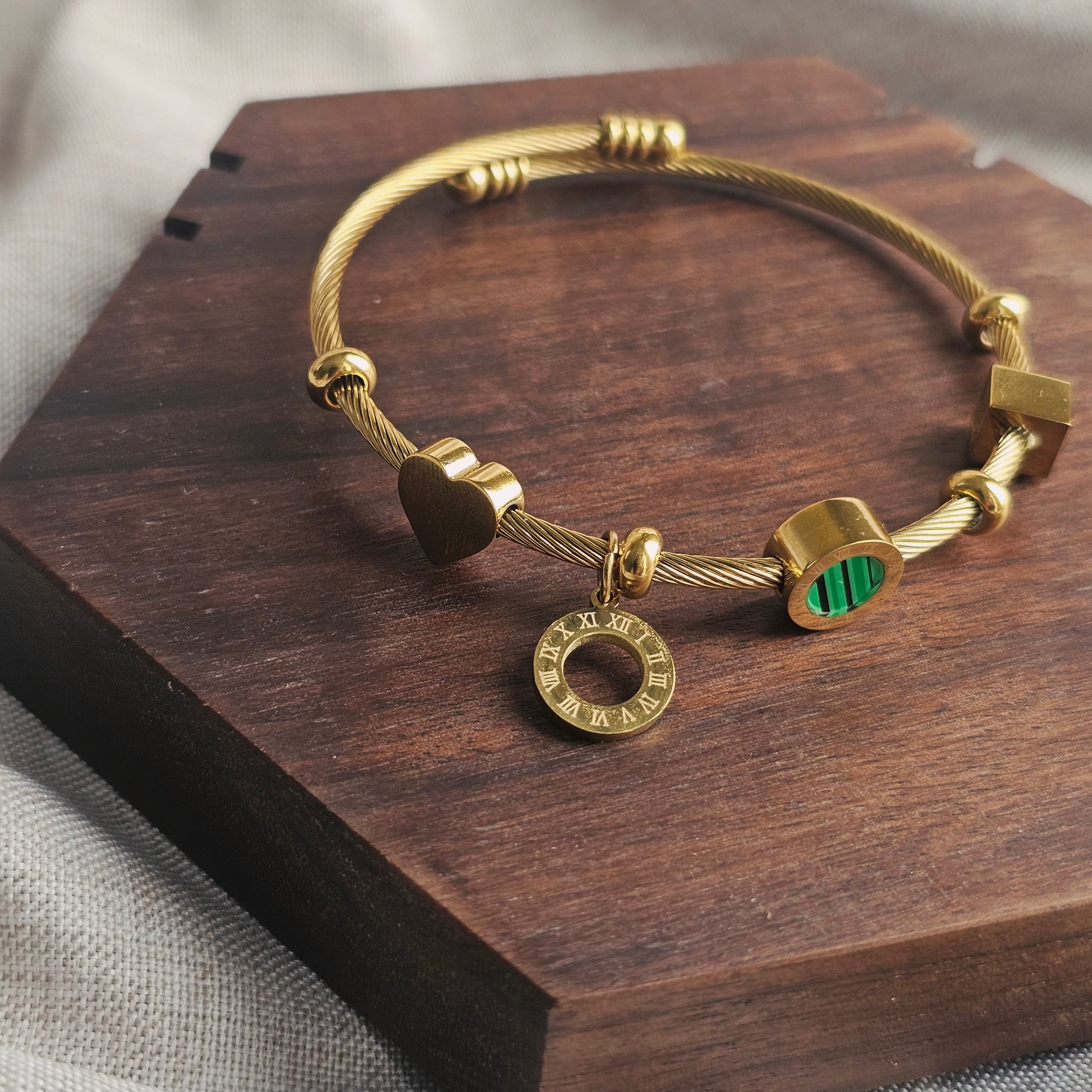 Our signature twisted cable cuff bracelet in 18k gold-plated stainless steel, featuring a curated mix of distinctive charms: Roman numeral disc, malachite stone, geometric cube, and heart charm.