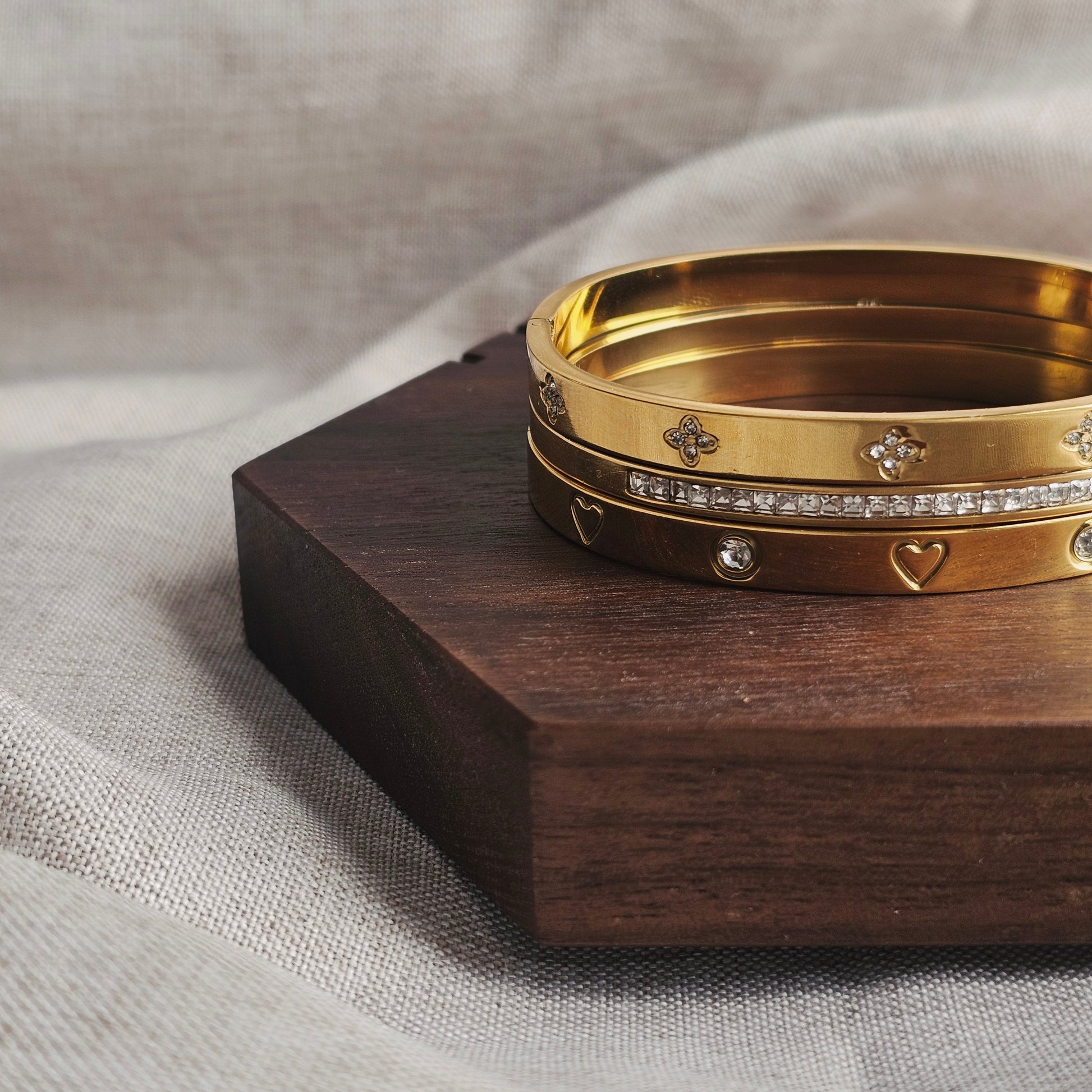 A sleek 18K gold-plated stainless steel bangle featuring a hinged design for easy wear. Its clean lines add a subtle, modern shine—perfect for stacking or wearing solo.